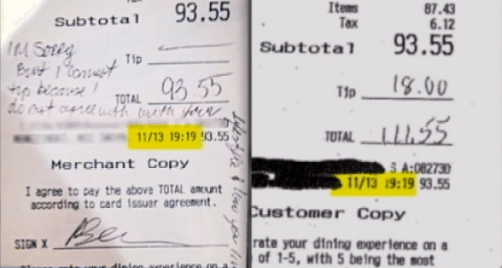 A couple dining with their children at Morales’ restaurant on the evening in question recognized the receipt – and provided NBC New York with a receipt from their records bearing the same time stamp. That receipt showed that an $18.00 tip was left on the $93.55 tab (a 19 percent gratuity). Not only that, the family provided credit card records showing they were charged $111.55 (the price of the meal and the tip).