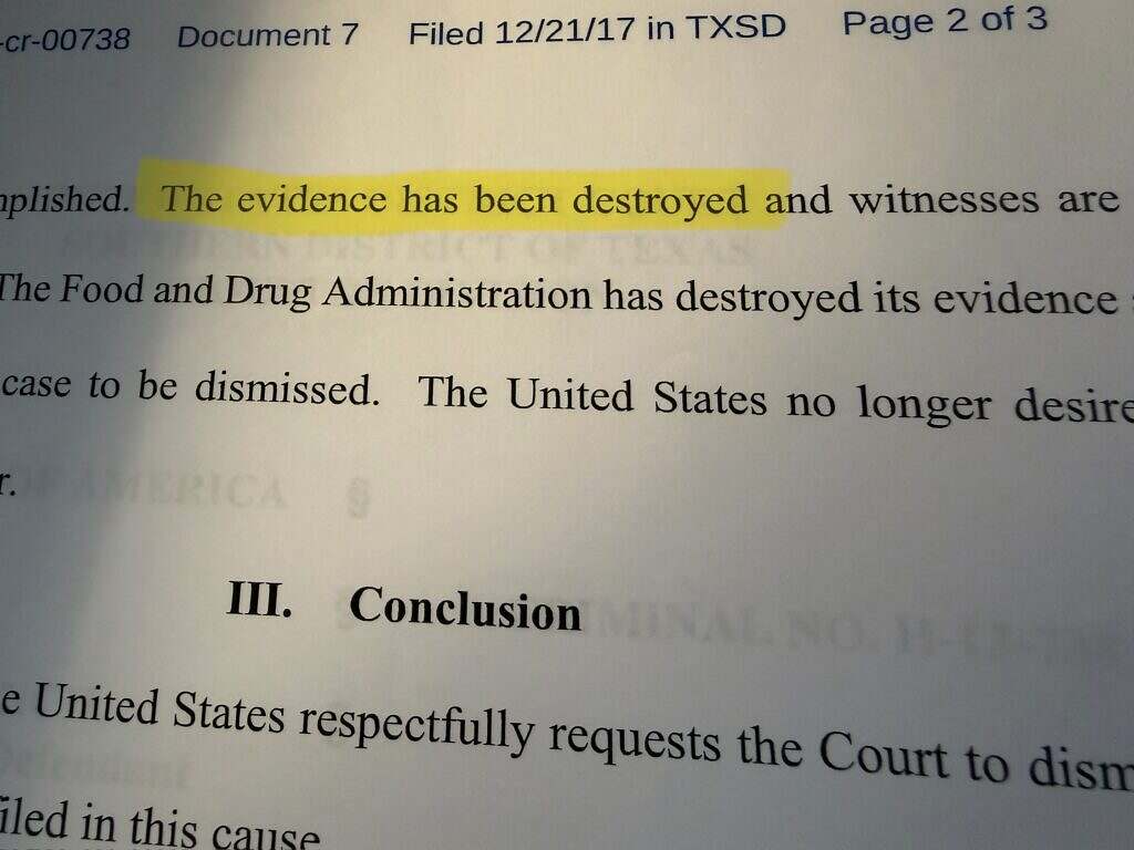 “The (FDA) has destroyed its evidence and has requested this case to be dismissed,” the motion continued. “The United States no longer desires to prosecute this matter.”